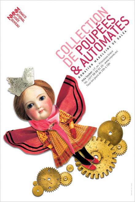 Nouveau Musée National de Monaco. Poster and identity promoting the doll collection. The illustration is a collage of bits of images from the collection.